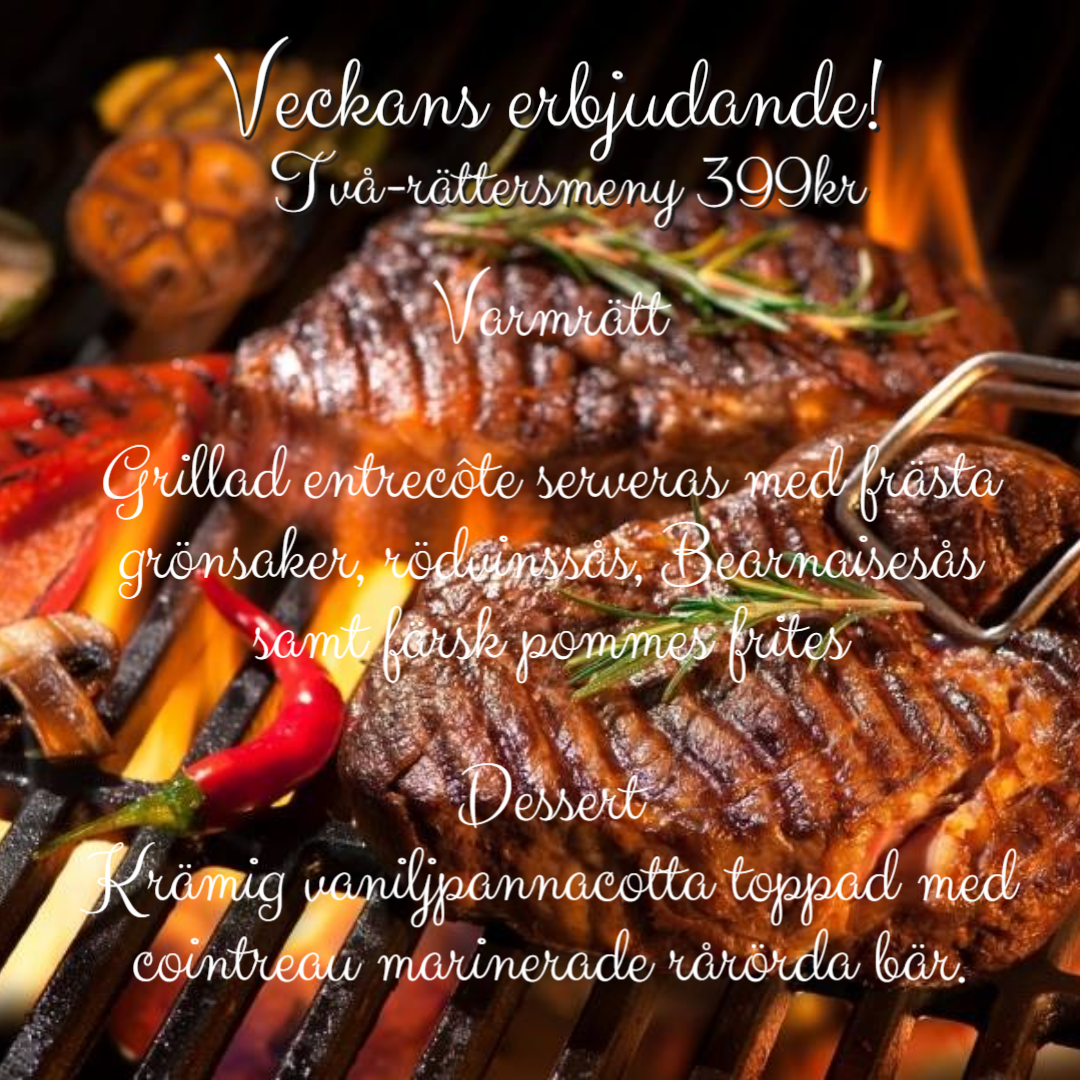 Varmrätt: Grillad Entrecôte 350G (från Sverige) serveras med frästa grönsaker, grillad tomat, färsk pommes bearnaisesås, rödvinssås.